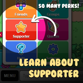 A supporter is a player who contributes to the game's development by paying a monthly subscription fee. Supporters are distinguished in-game by a sparkling/colored name tag, available in colors like red, orange, pink, purple, green, or blue. Additionally, supporters gain exclusive access to supporter-only items and access to previews of upcoming features via Discord, just to name a couple of perks. For more information, check out "Menu" > "Supporter".